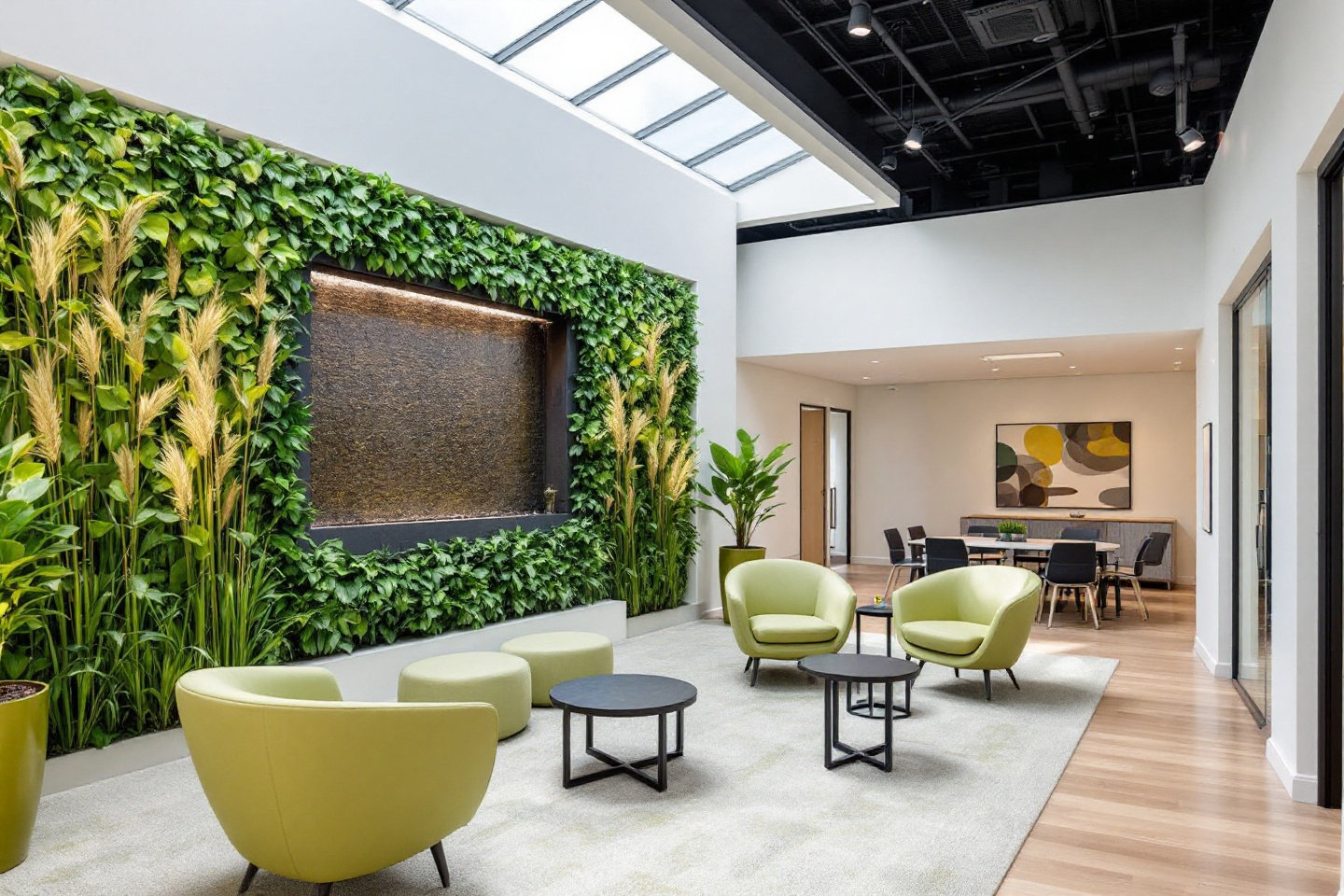 - Uredi: vertikalni vrtovi ili zidovi od mahovine potiču produktivnost; prirodno svjetlo i stolovi s glinenom završnom obradom stvaraju prostore za koncentraciju.