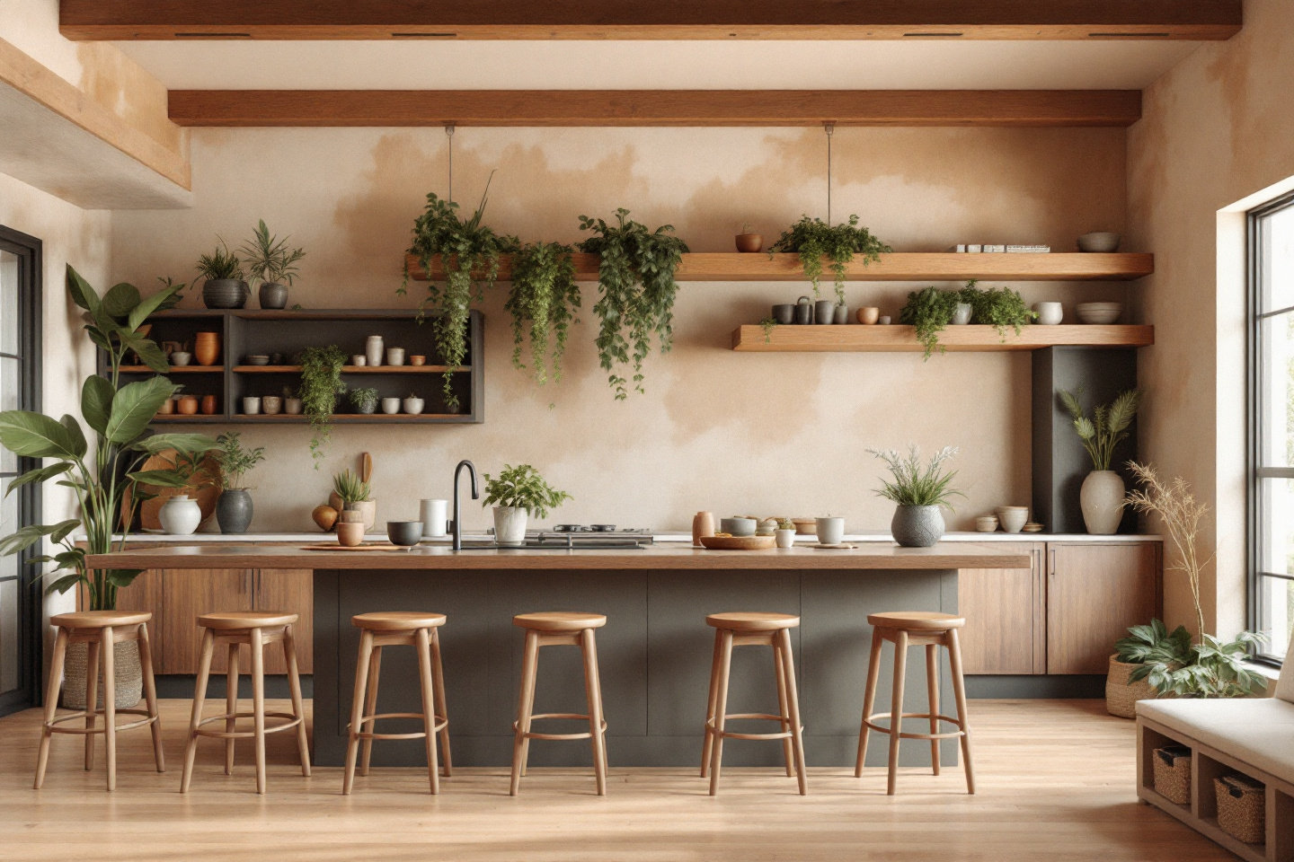 - Kuhinje: biljne vrtove na radnim pločama ili otoke od recikliranog drva spajaju funkcionalnost i prirodu, a zemljani okerni tonovi backsplash-a dodatno naglašavaju taj dojam.